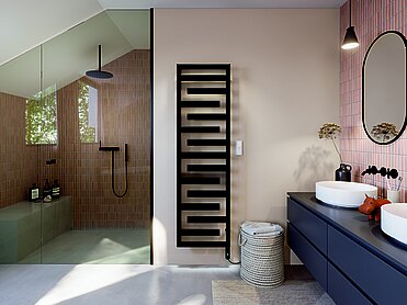 Farbige Zehnder Design-Heizkörper mit Zubehör in Heizkörperfarbe für moderne Badezimmer