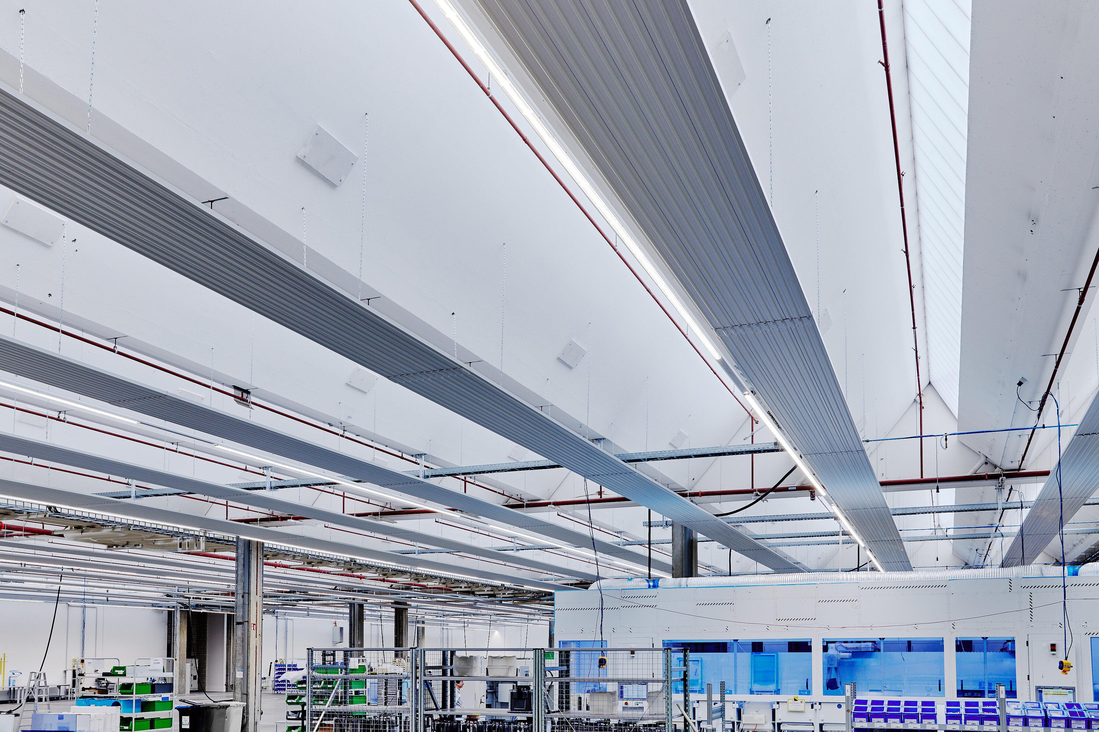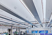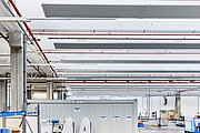 Die Montage erfolgte via Kettensystemen, die wiederum am Sheddach der Halle befestigt wurden. Dank des geringen Gewichts der Deckenstrahlplatten Zehnder ZFP stellte die Statik dabei kein Problem dar. Bei der Planung und Installation konnten die ausführenden Firmen außerdem dafür sorgen, dass die Lichtbänder in der Decke nicht verdeckt werden. Die Mitarbeitenden von RENA Technologies profitieren somit neben der angenehmen Temperierung weiterhin vom Tageslichteinfall. Ausgelegt wurden die Deckenstrahlplatten mit einer Vorlauftemperatur von 75 °C sowie einer Rücklauftemperatur von 50 °C bei 20 °C Raumtemperatur. Aufgrund der Flexibilität bei Vor- und Rücklauftemperaturen konnten die alten Heizrohre dabei einfach weiterverwendet werden und mussten nicht aufwendig ausgetauscht werden. Die Energiezentrale des Hallenkomplexes ist in einem eigenen Gebäude untergebracht und besteht aus einer Gasbrennwertheizung mit zwei Kesseln á 1.000 kW Leistung.