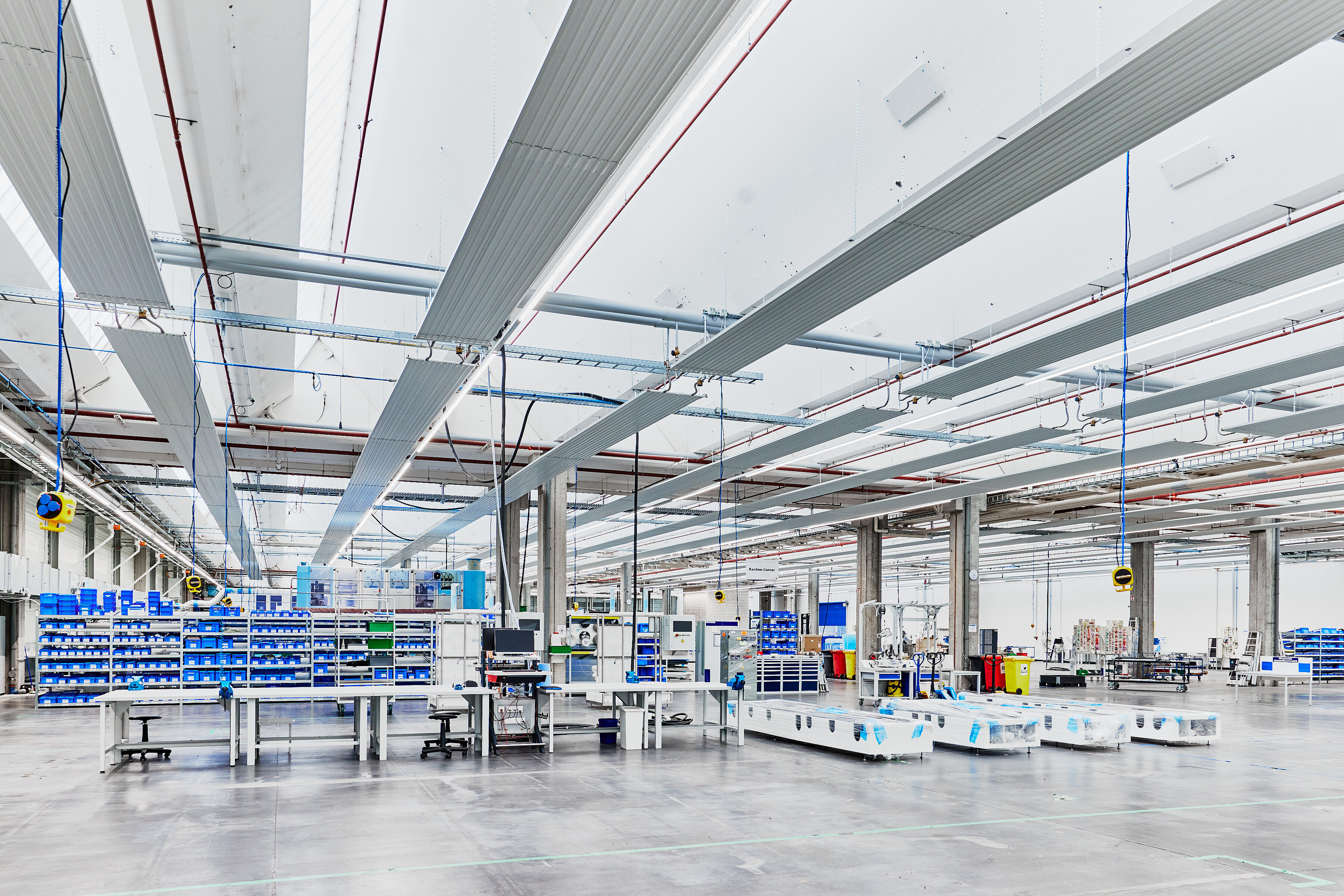Neben der Installation des neuen Heizsystems fielen eine ganze Reihe weiterer Aufgaben an, die parallel und unter dem großen zeitlichen Druck zu erledigen waren. Zusätzlich zur Beseitigung der Überreste des Vormieters galt es, neue Zwischenwände zu errichten, Elektroleitungen zu verlegen, sowie für die Verfügbarkeit von Druckluft und Wasser zu sorgen. „Ohne die optimale Verzahnung aller Gewerke, die parallel in der Großhalle an der Fertigstellung arbeiteten, wäre der Abschluss der Sanierung niemals rechtzeitig möglich gewesen“, stellt Michael Schönfelder fest und fügt hinzu: „Während den Arbeiten in der Produktionshalle kam seitens RENA Technologies noch der Wunsch nach einem Lagerplatz für die fertiggestellten Anlagen auf. Dafür wurde kurzerhand eine angrenzende Halle mit knapp 3.000 m2 angemietet, wo nochmals 13 Deckenstrahlplatten Zehnder ZFP mit einer Gesamtlänge aller Bänder von insgesamt 770 Laufmetern installiert wurden. Der Zeitplan geriet dabei zu keiner Zeit in Gefahr, was zu einem großen Teil an der Flexibilität liegt, die Zehnder auch hier wieder einmal bewiesen hat“.