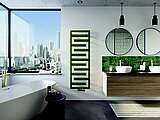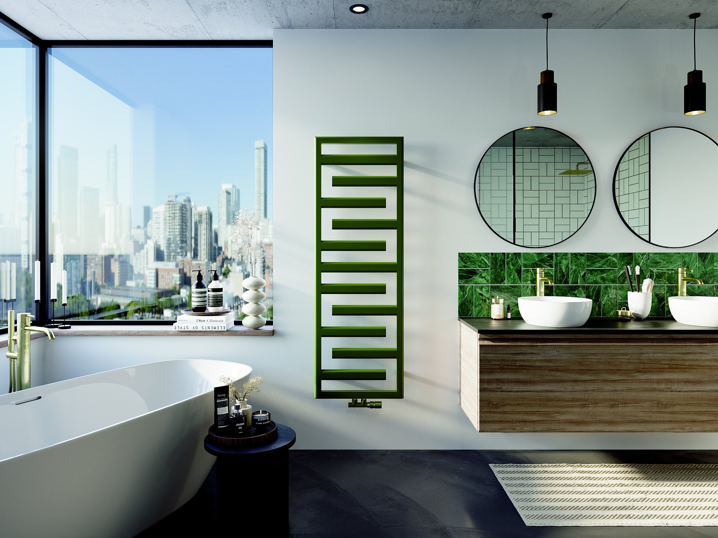 Mit dem Badheizkörper Zehnder Tetris wurde der Leitsatz der Studio Collection „form follows function“ wieder einmal eindrucksvoll unter Beweis gestellt. So besteht das formschöne Design aus vertikal angeordneten, nach außen abgerundeten D-Profilrohren sowie versetzt angeordneten Flachovalrohren. Die dadurch entstehenden großzügigen Aussparungen bieten Platz zum bequemen Aufhängen von mehreren Badetüchern. Seitliche und am oberen Rand angeordnete D-Profilrohre sowie ein Vierkantrohr unten bilden den funktionalen Rahmen des Design-Heizkörpers.