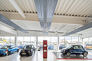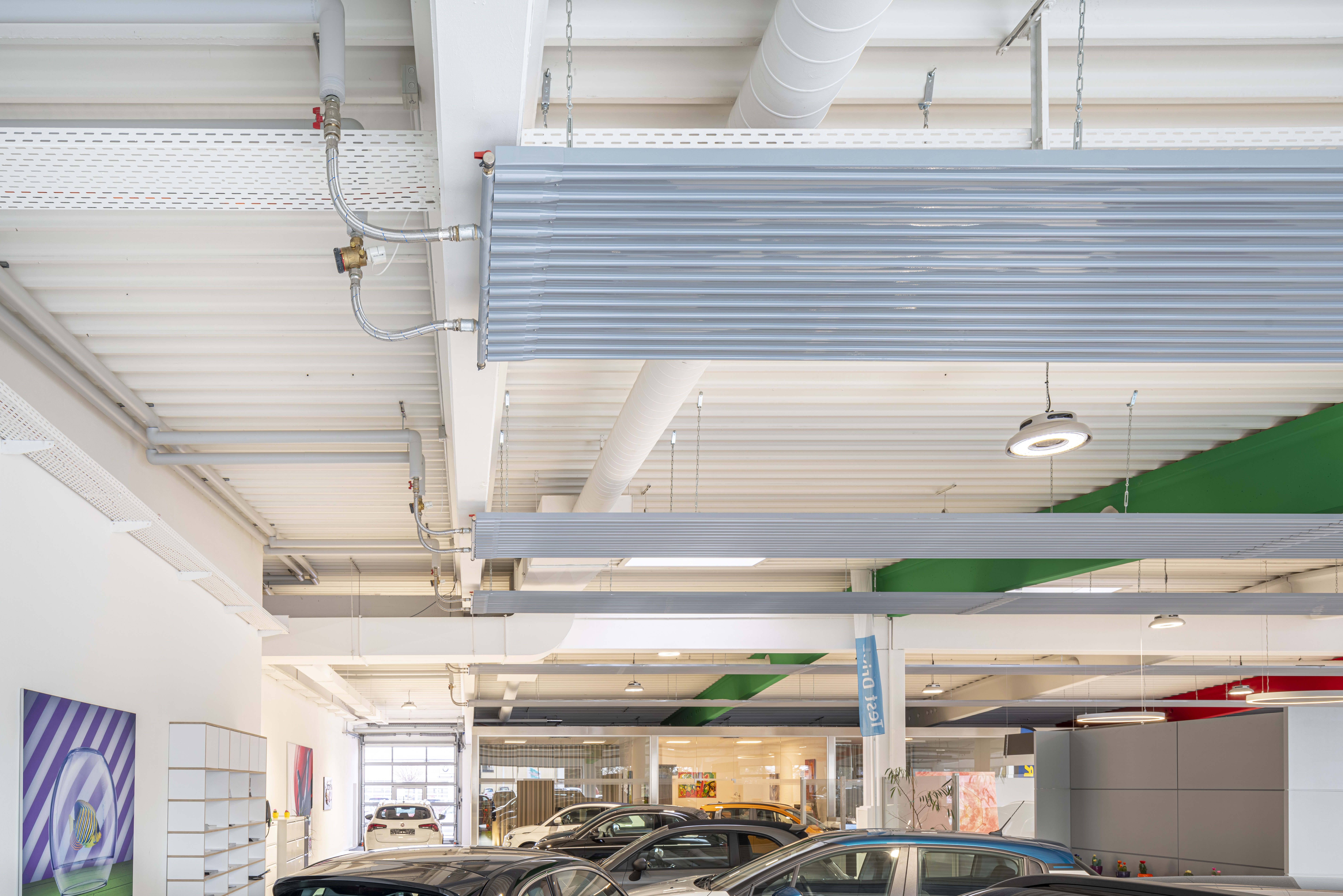 Dank des Strahlungsprinzips der Zehnder Deckenstrahlplatten reicht in dem geräumigen Showroom bereits eine Raumtemperatur von 20 °C aus, um bei Besuchern wie Verkaufspersonal für ein angenehmes Wärmeempfinden zu sorgen. Die dafür benötigte Vorlauftemperatur beträgt 70 °C, die Rücklauftemperatur liegt bei 55 °C. Aber auch bei geringeren Vorlauftemperaturen, wie sie zum Beispiel Wärmepumpen besonders energieeffizient erzeugen, stellen Zehnder Deckenstrahlplatten eine optimale Lösung dar. Gebietsleiter Bernd Sämann beschreibt die Vorzüge des neuen Heizsystems: „Früher wurde hier die aufgeheizte Luft einfach an die Decke geblasen, was für ungleiche Wärmeverteilung und unangenehme Zugluft sorgte. Nun strahlt die Wärme stattdessen gleichmäßig von der Decke in den Showroom – ganz ohne störende Geräusche, dafür aber mit hoher Energieeffizienz!“. Außerdem kommt es beim Einsatz von Deckenstrahlplatten zu keinerlei Staub- und Schmutzaufwirbelungen. So bewahren die polierten Ausstellungsfahrzeuge länger ihren Glanz und müssen seltener gereinigt werden.