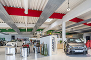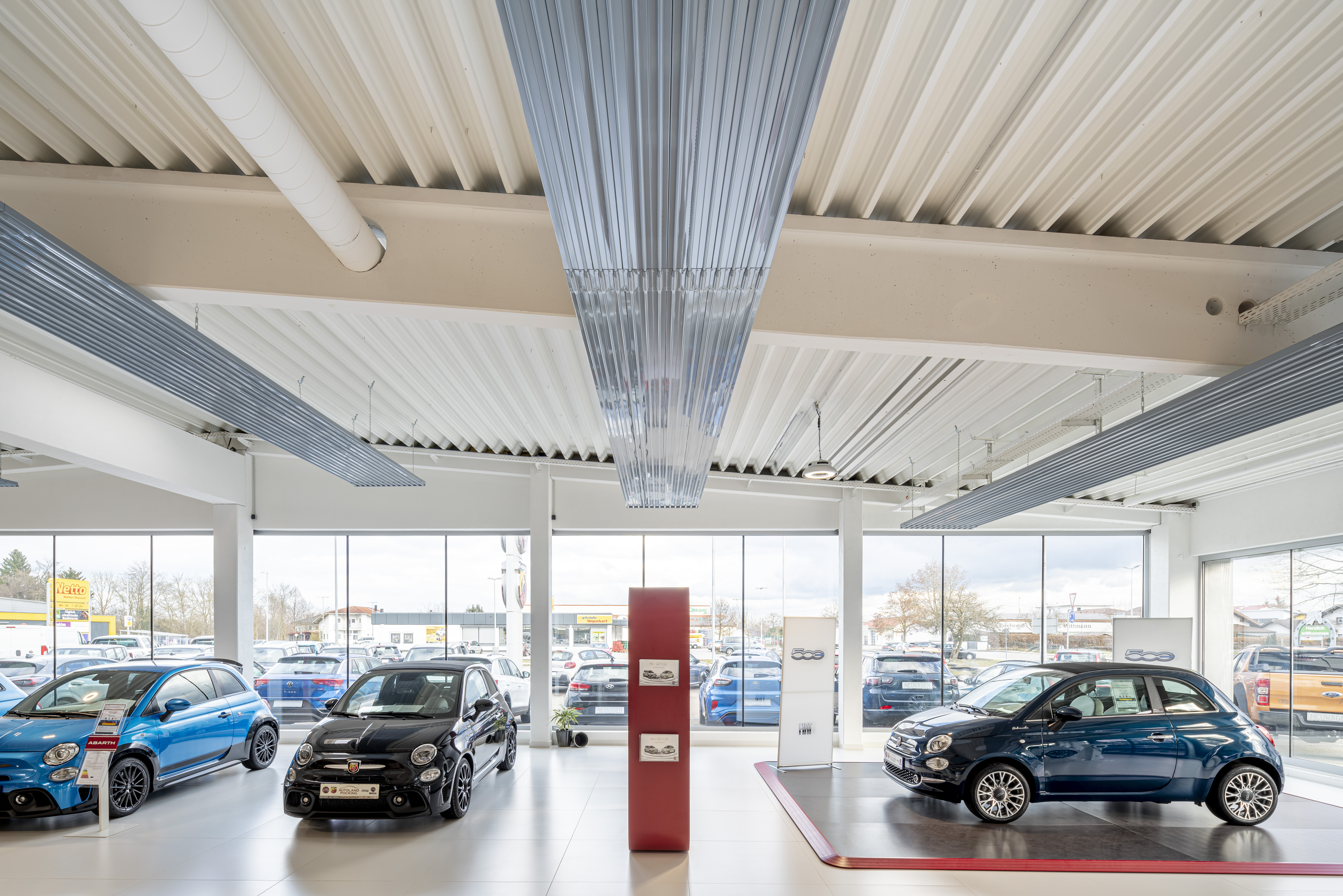 Lahr, Juni 2025. Das Autoland Pocking bei Passau empfängt seine Kunden in einer großzügigen Ausstellungs- und Verkaufshalle: Das imposante Mehrmarkencenter bietet Platz für zahlreiche Fahrzeuge verschiedener Hersteller. Vom sportlichen Rennwagen über den robusten SUV bis hin zum geräumigen Familientransporter glänzen hier vor riesigen Glasfronten eindrucksvolle Fahrzeuge im Sonnenlicht um die Wette. Doch auch wenn der Showroom rein optisch keinerlei Anlass zur Klage gab, wollten die Betreiber mehr Energieeffizienz bei der Hallenbeheizung erzielen. So entschied man sich 2022 im Rahmen von grundsätzlichen Sanierungsarbeiten für Deckenstrahlplatten als Heizsystem für den weitläufigen Altbaukomplex. Dabei konnten die Deckenstrahlplatten insbesondere den Mitarbeiterwunsch nach gleichmäßiger Wärmeverteilung ohne Zugluft auf einem stets angenehmen Temperaturniveau erfüllen und sorgen somit im wahrsten Sinne des Wortes für perfektes Arbeitsklima.