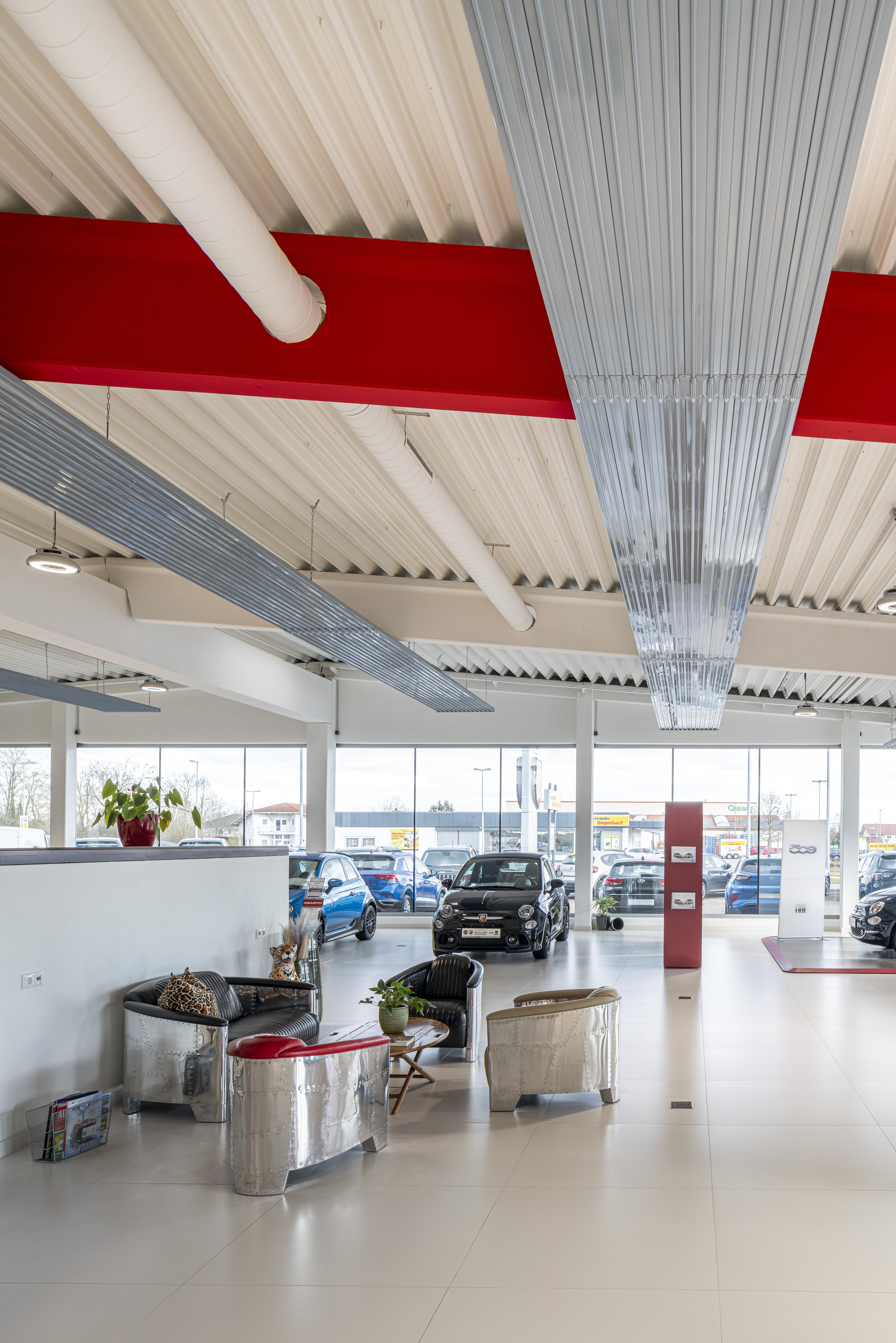 In der weitläufigen Ausstellungshalle des Autolands wurden insgesamt fünf Bänder mit Deckenstrahlplatten Zehnder ZFP à 30 m Länge und 1,05 m Breite installiert.Auch die ästhetischen Ansprüche der Bauherrin konnte Zehnder berücksichtigen.Auf Wunsch wurden die Zehnder Deckenstrahlplatten in der Sonderfarbe Grau (RAL 7001) geliefert.