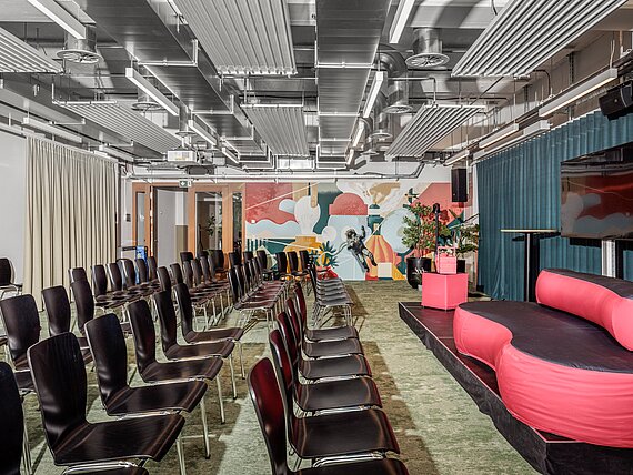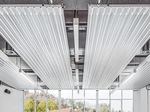Die Deckenstrahlplatten betonen durch ihr Design das industrielle Ambiente im Zentrum für Innovation und Digitalisierung.