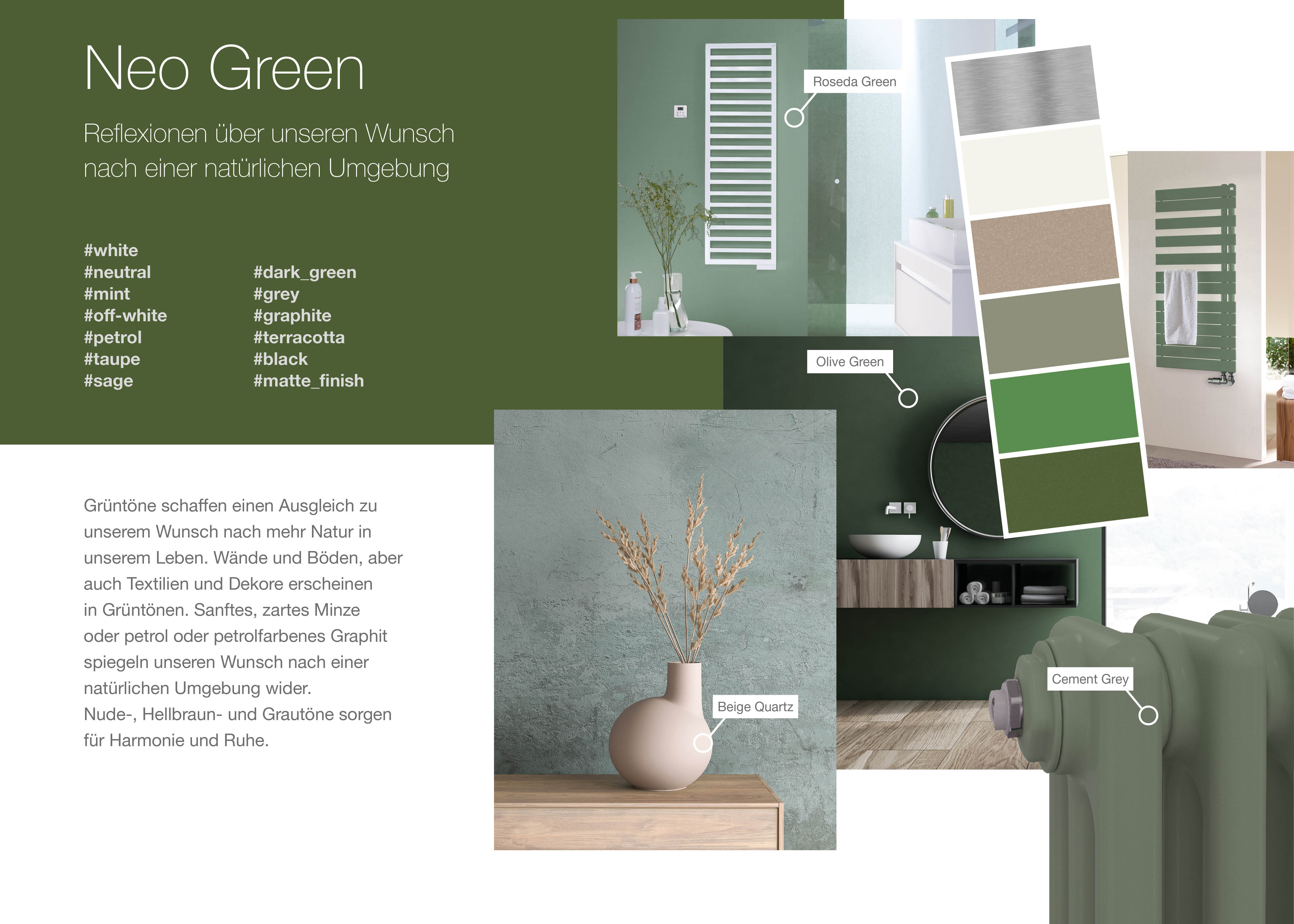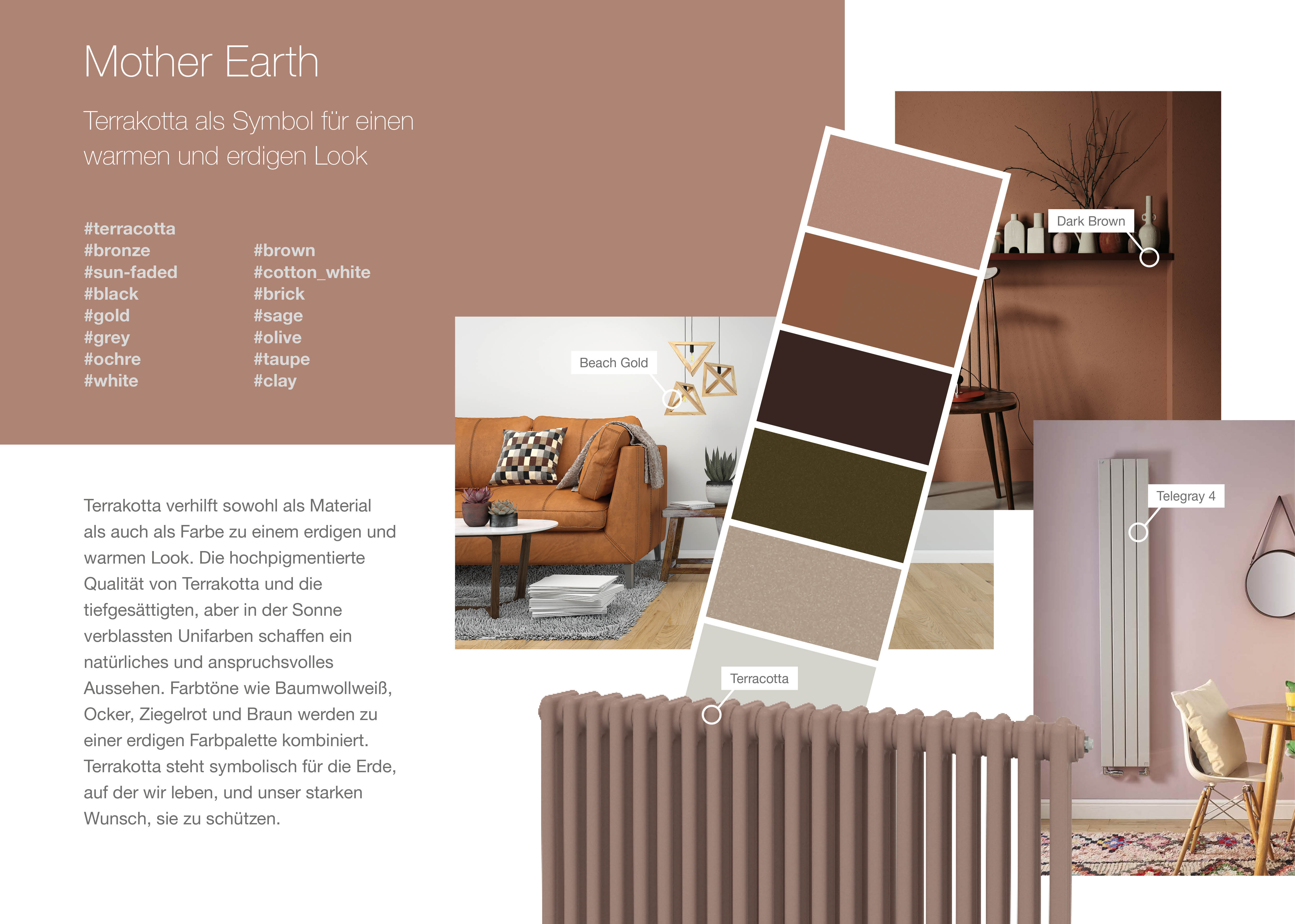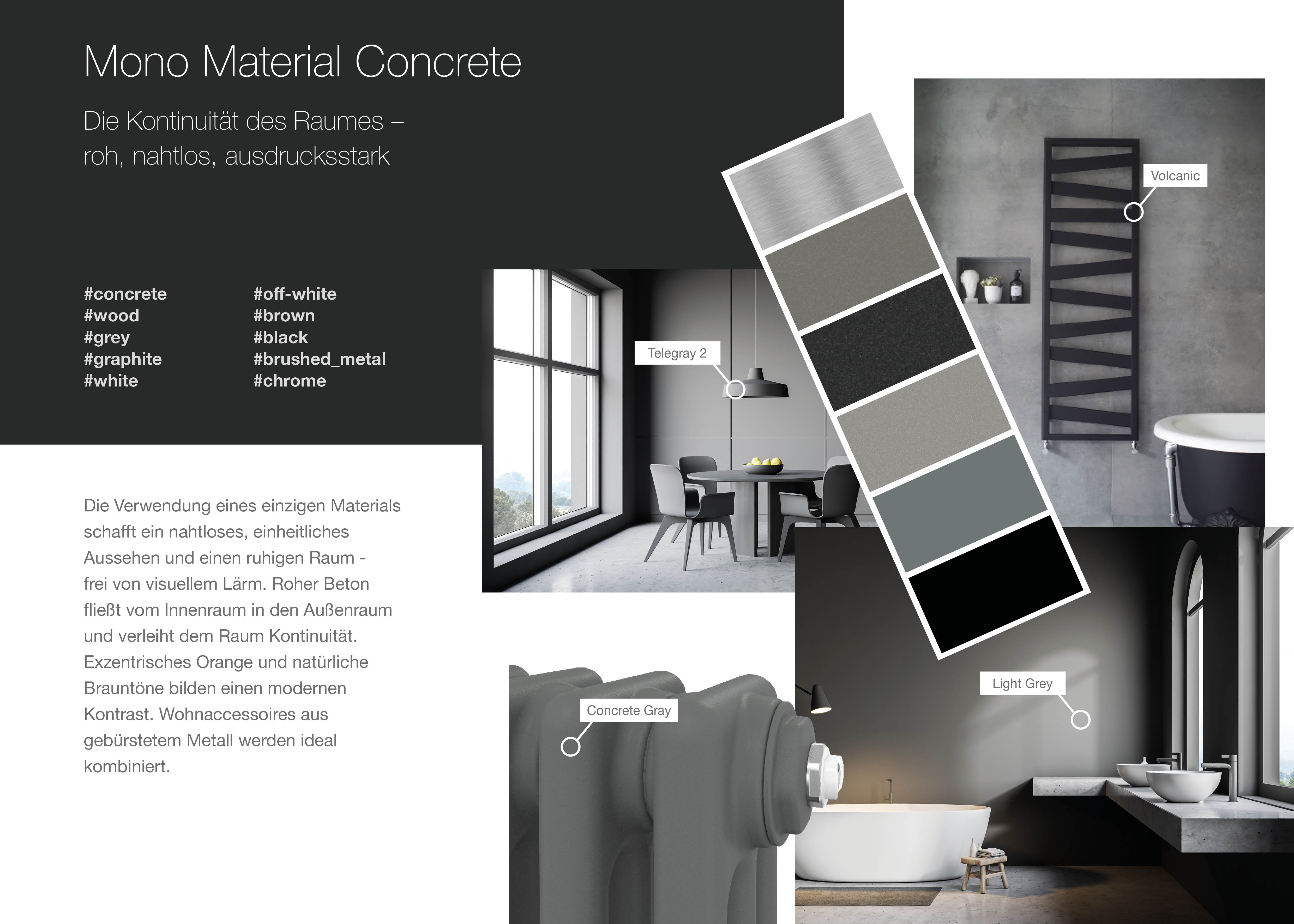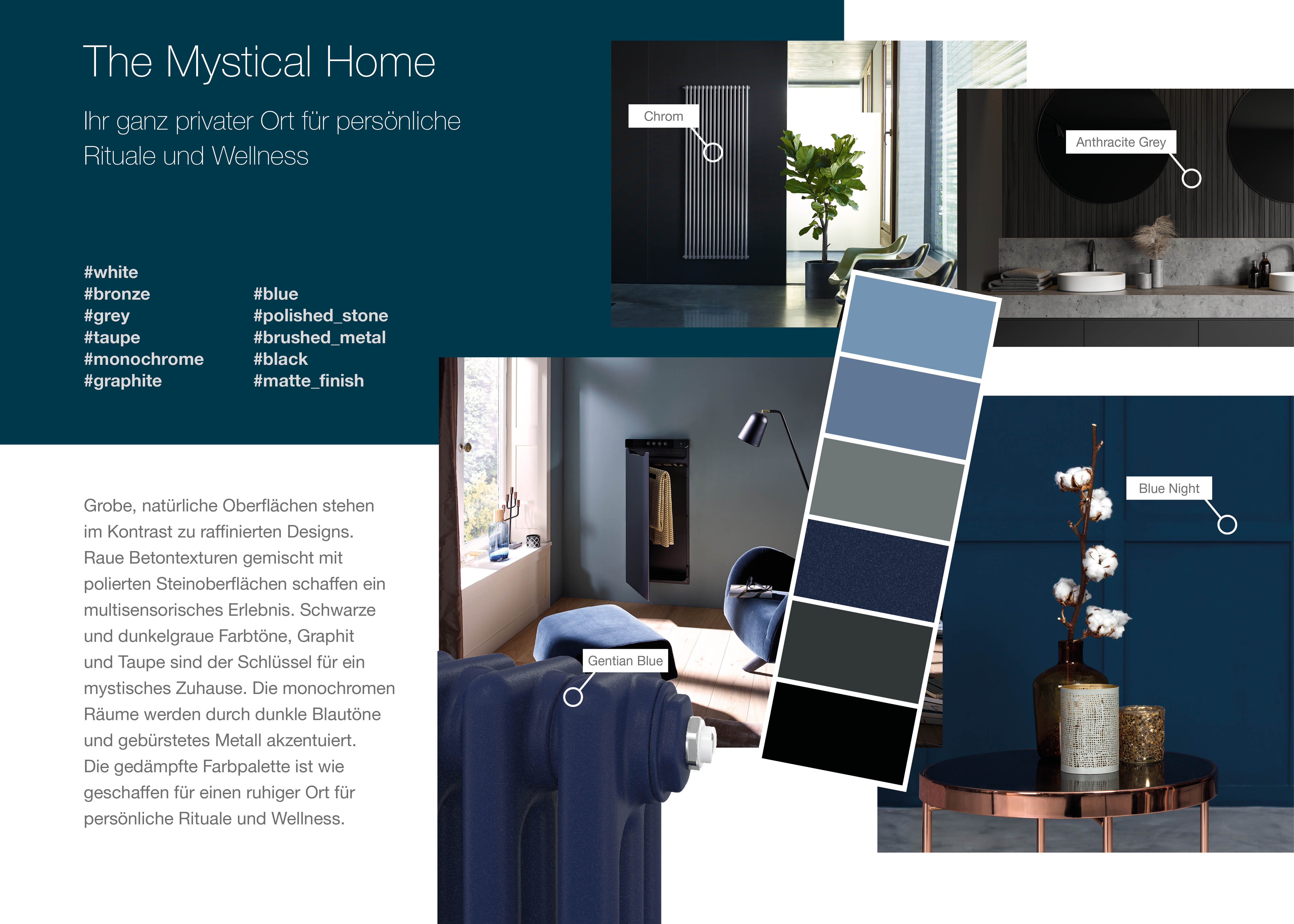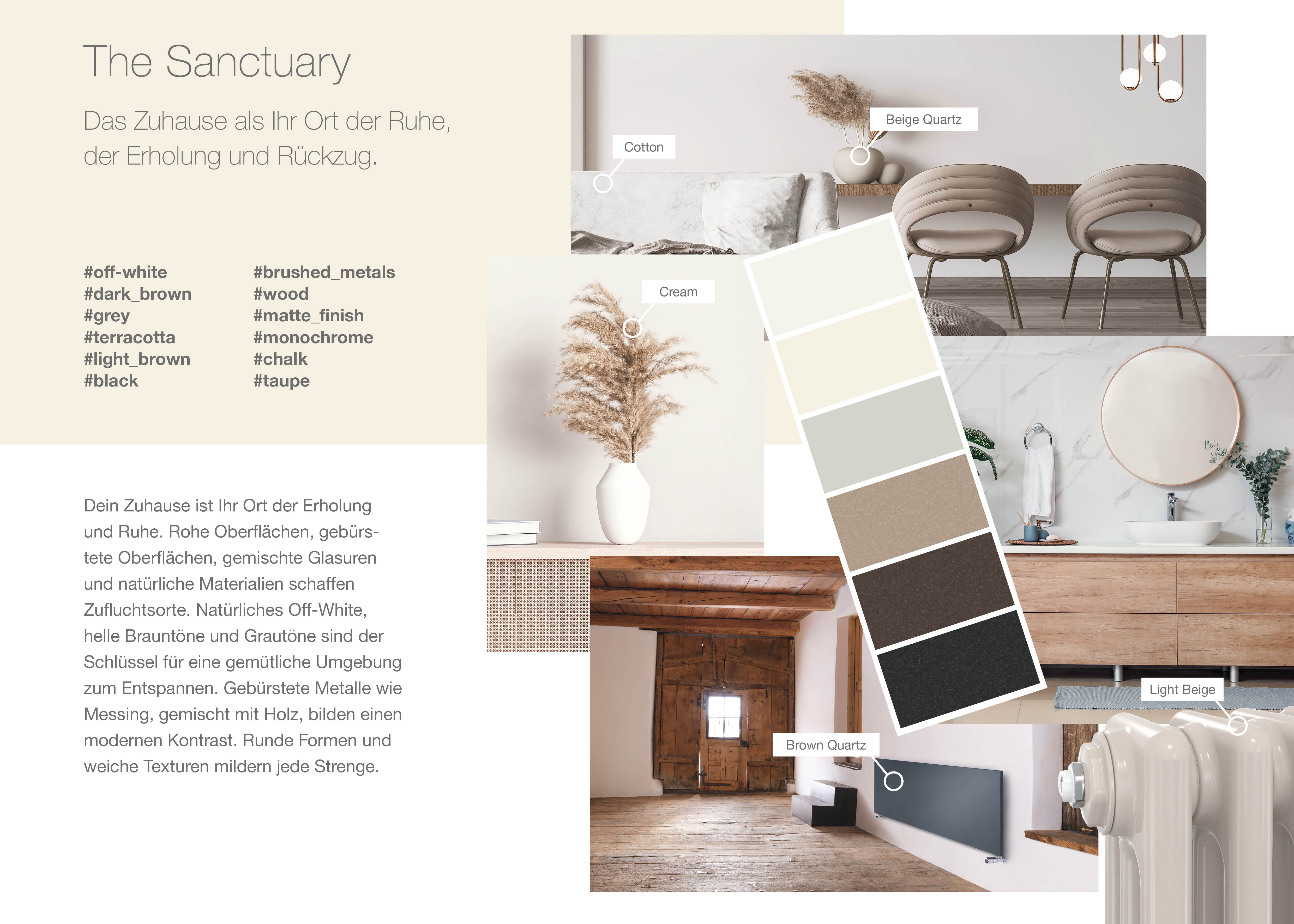 Bei der Konzeptentwicklung haben wir renommierte Farbtrend-Experten mit eingebunden. Langfristige Trends aus sechs Bereichen – Architektur, Interior Design, Bad, Living, Oberflächen und Materialien – wurden analysiert und in das Konzept integriert, um eine zukunftsorientierte Farbpalette zu gestalten. Für ein immer aktuell bleibendes System und der Balance zwischen Modeerscheinungen und langfristigen Trends, wurden aus diesen Farb- und Wohntrends fünf moderne Zehnder Farbwelten abgeleitet.