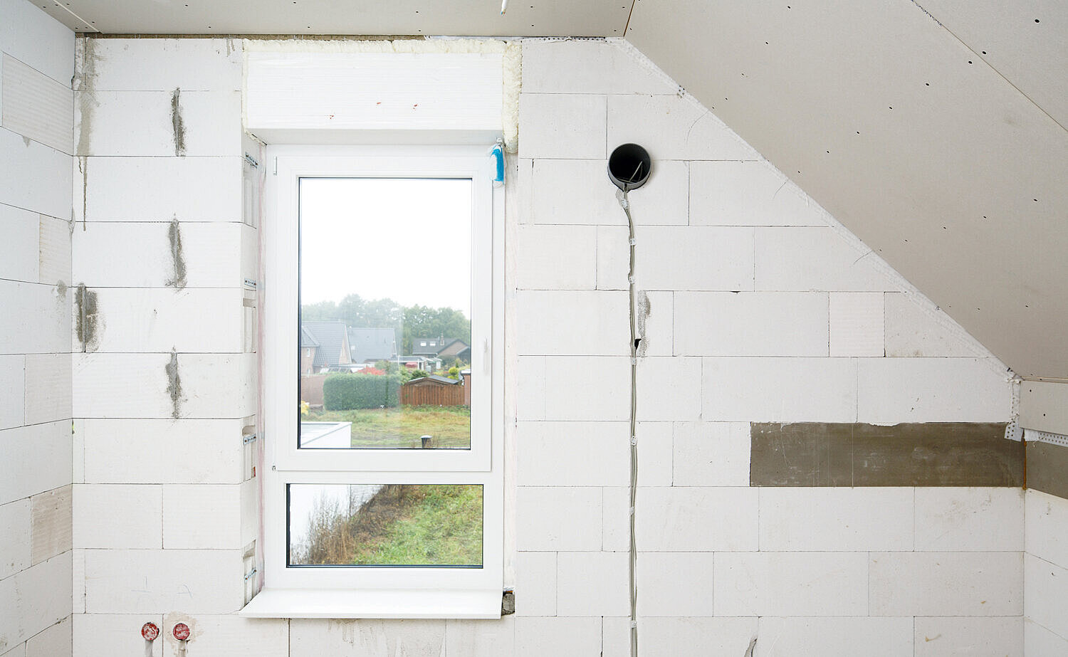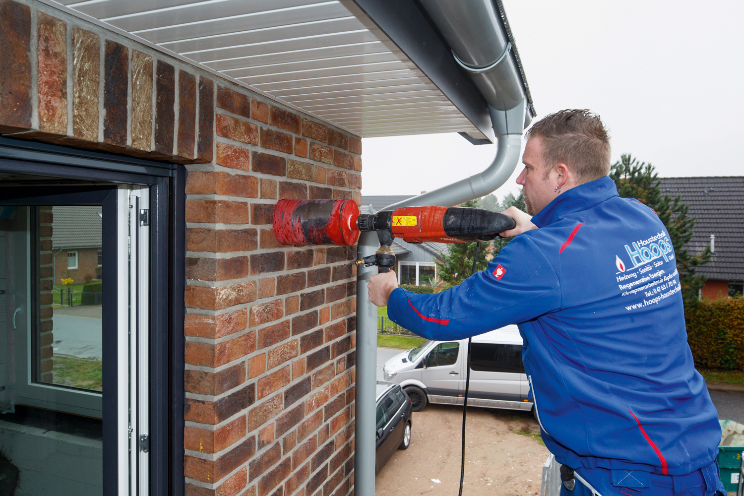 Für den Einbau der dezentralen Lüftungsgeräte sind lediglich Kernlochbohrungen und Stromanschlüsse erforderlich. Diese wurden in der Rohbau-Phase des Mehrfamilienhauses, kurz nach dem Richtfest, vom SHK-Fachplanerunternehmen Hoops Haustechnik durchgeführt.