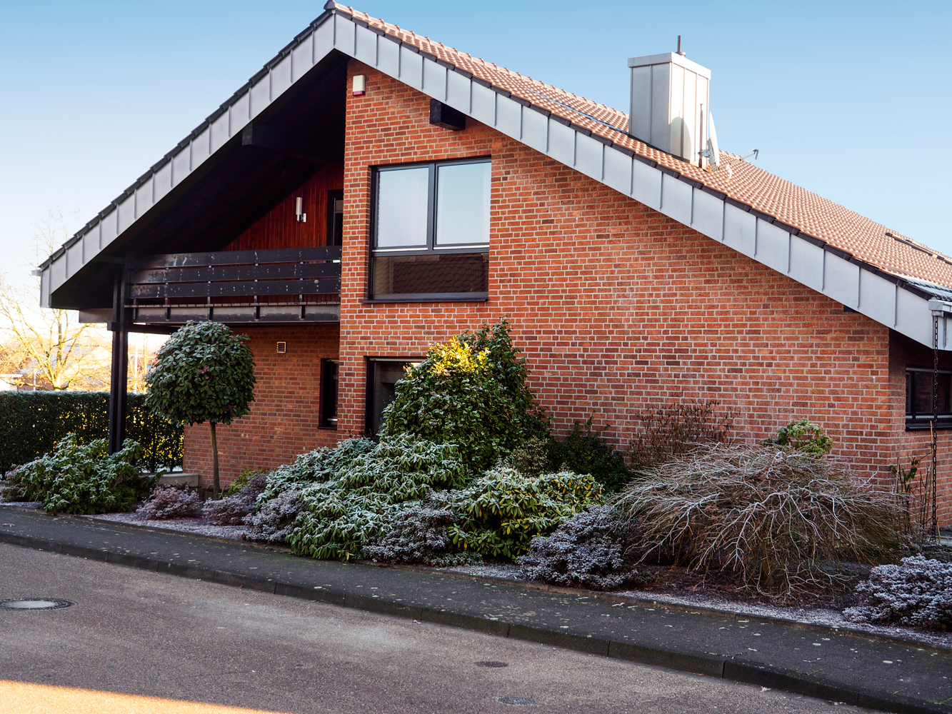 Das Schlafzimmer im Erdgeschoss rechts wurde ursprünglich durch die Terrassentür mit frischer Außenluft versorgt. Seit der Umgestaltung der Veranda zum Wintergarten war dies nicht mehr möglich. Nach einem minimalen Eingriff in den Baukörper sorgt nun ein unauffälliges dezentrales Komfort-Lüftungsgerät mit Enthalpietauscher energieeffizient für optimales Raumklima (links neben dem Vordach).