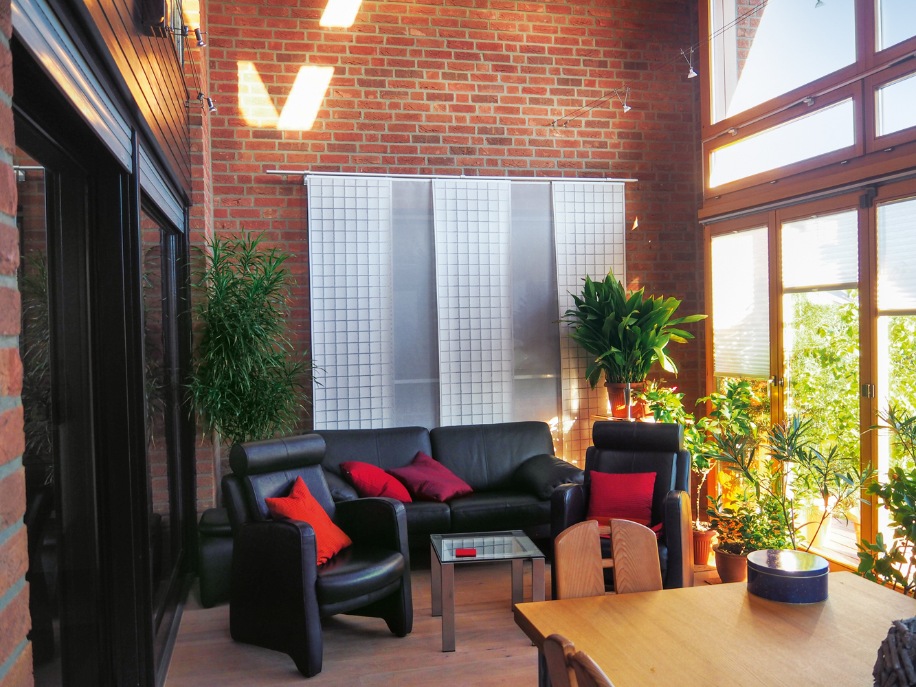 Vom Schlafzimmer betritt man nun direkt den Wintergarten. Für ausreichend Frischluft im Schlafgemach, das nun nicht mehr direkt über die Terrassentür belüftet werden kann, sorgt jetzt ein hocheffizientes dezentrales Komfort-Lüftungsgerät mit Enthalpietauscher. Es regelt nicht nur die Frischluftzufuhr, sondern auch die Raumluftfeuchte.