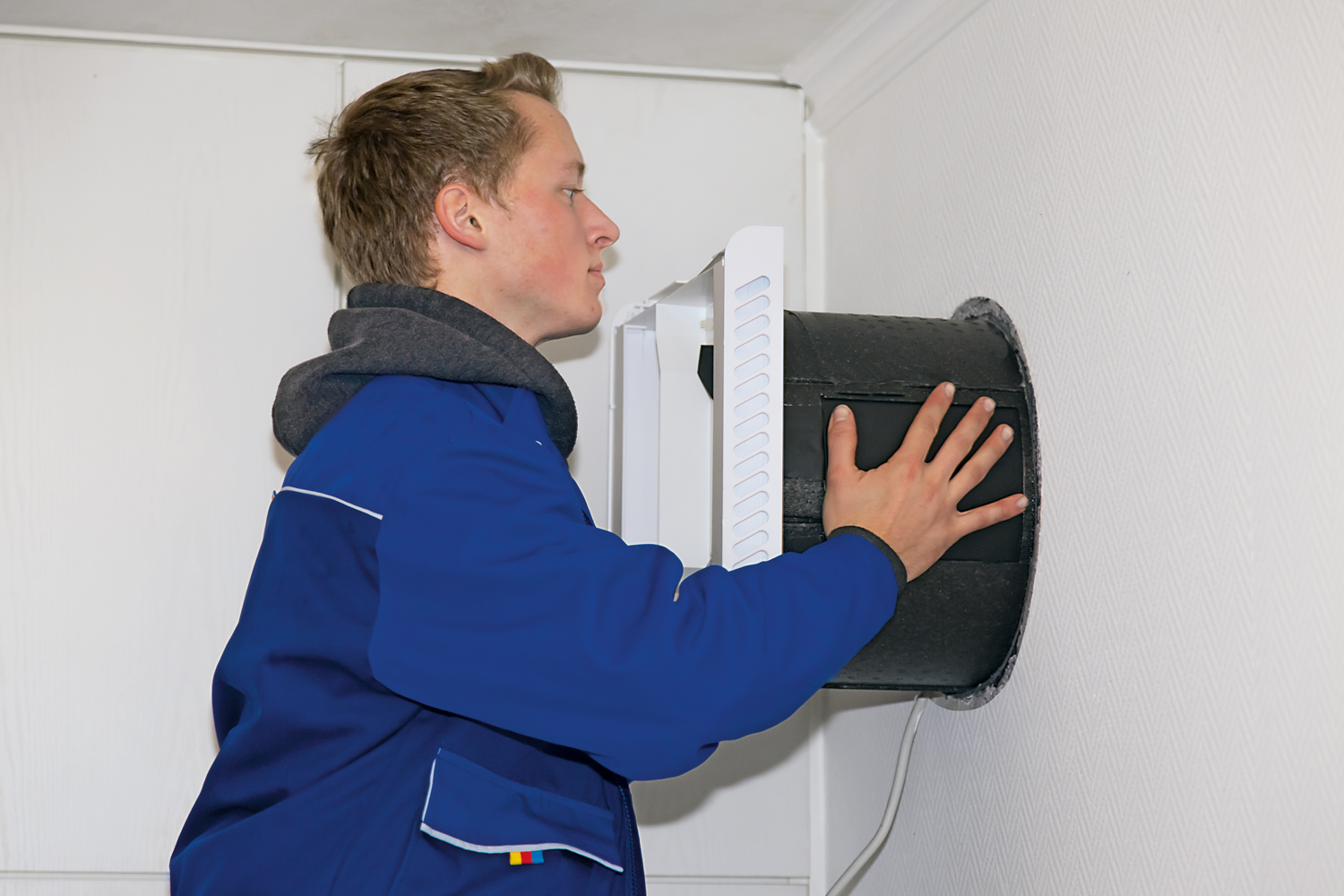 Die gesamte Technik der dezentralen Wohnraumlüftung befindet sich in einem Einbaurohr aus EPP. Diese Ummantelung bietet hervorragende Wärme- und Schalldämmung. Das System wird einfach in die Kernlochbohrung geschoben und am Stromnetz angeschlossen.