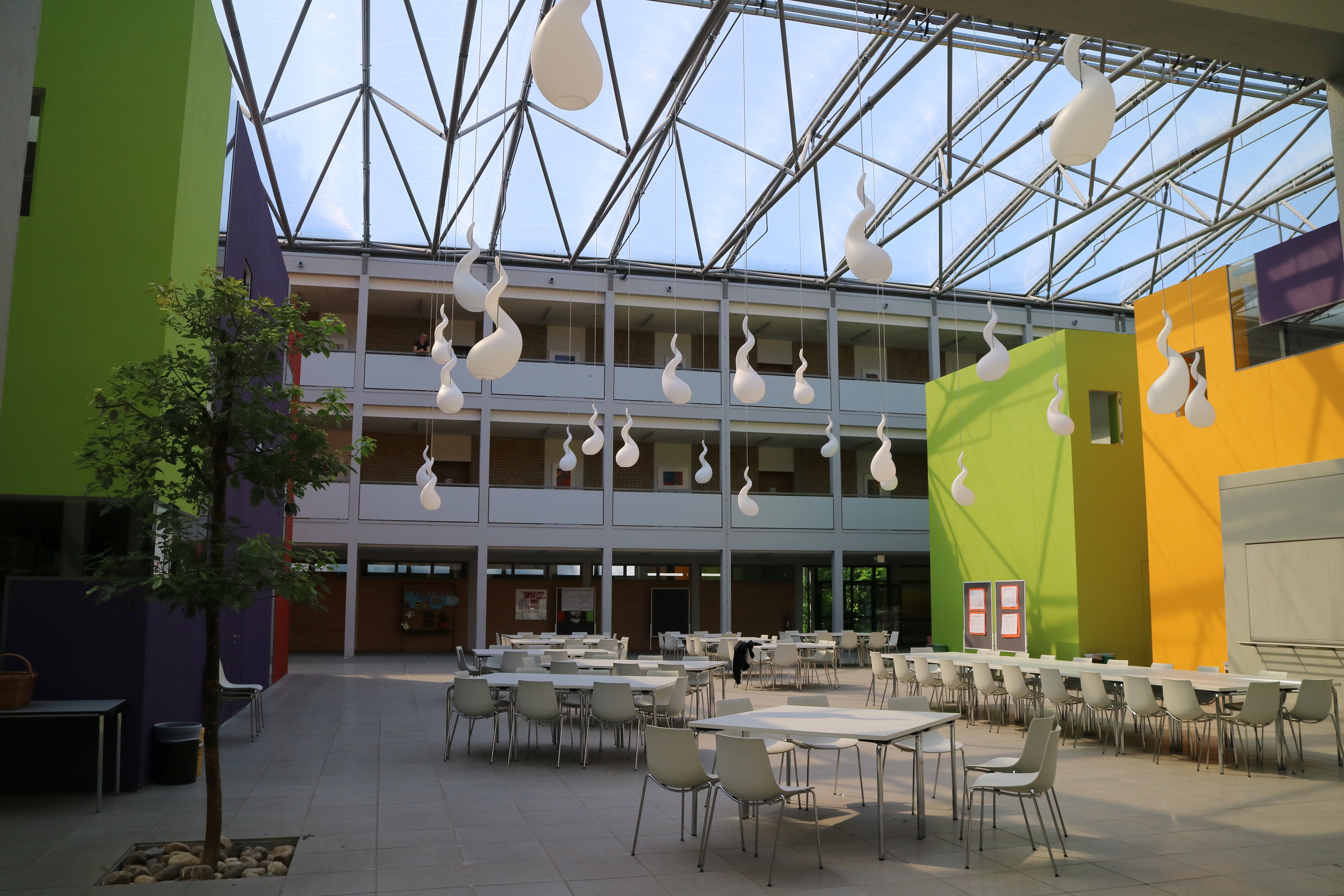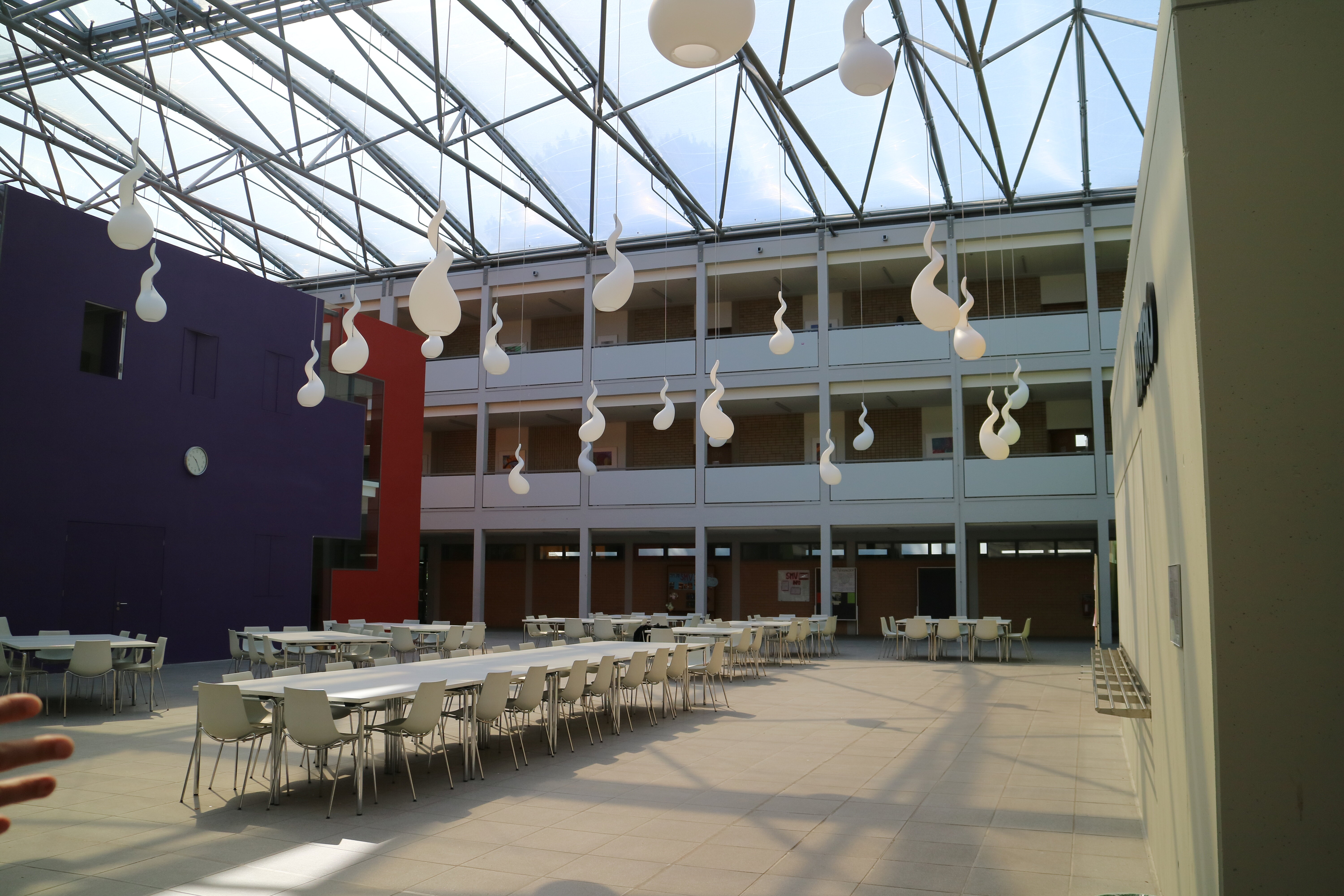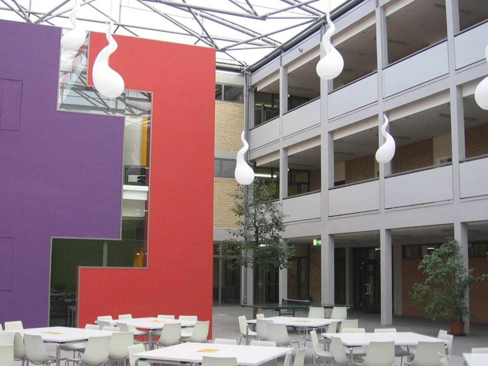 Zunächst war für den Ganztagsbetrieb sowie die Mensa die Errichtung eines Neubaus geplant. Dass dies aber gar nicht erforderlich war, stellte sich heraus, als man die Möglichkeit entdeckte, den Innenhof mit Stahltragwerk und Folienkissen zu überdachen: Im so entstandenen Raum, der im Jahr 2010 feierlich eingeweiht wurde, sind heute die neuen schulischen Angebote untergebracht.