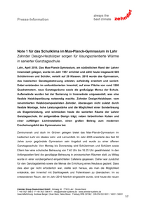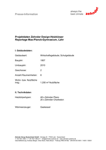 Das Max-Planck-Gymnasium, am südöstlichen Rand der Lahrer Innenstadt gelegen, wurde im Jahr 1957 errichtet und zählt heute insgesamt 665 Schülerinnen und Schüler, verteilt auf 29 Klassen. 2010 wurde das Gymnasium, das inzwischen Ganztagsbetreuung anbietet, aufwändig erweitert und saniert: Dabei entstanden im umfunktionierten Innenhof, auf einer Fläche von rund 1.200 Quadratmetern, neue Ganztagsräume sowie die großzügige Mensa der Schule. Außenwände wurden bei der Sanierung in Innenwände umgewandelt, was eine flexible Heizkörperlösung notwendig machte.