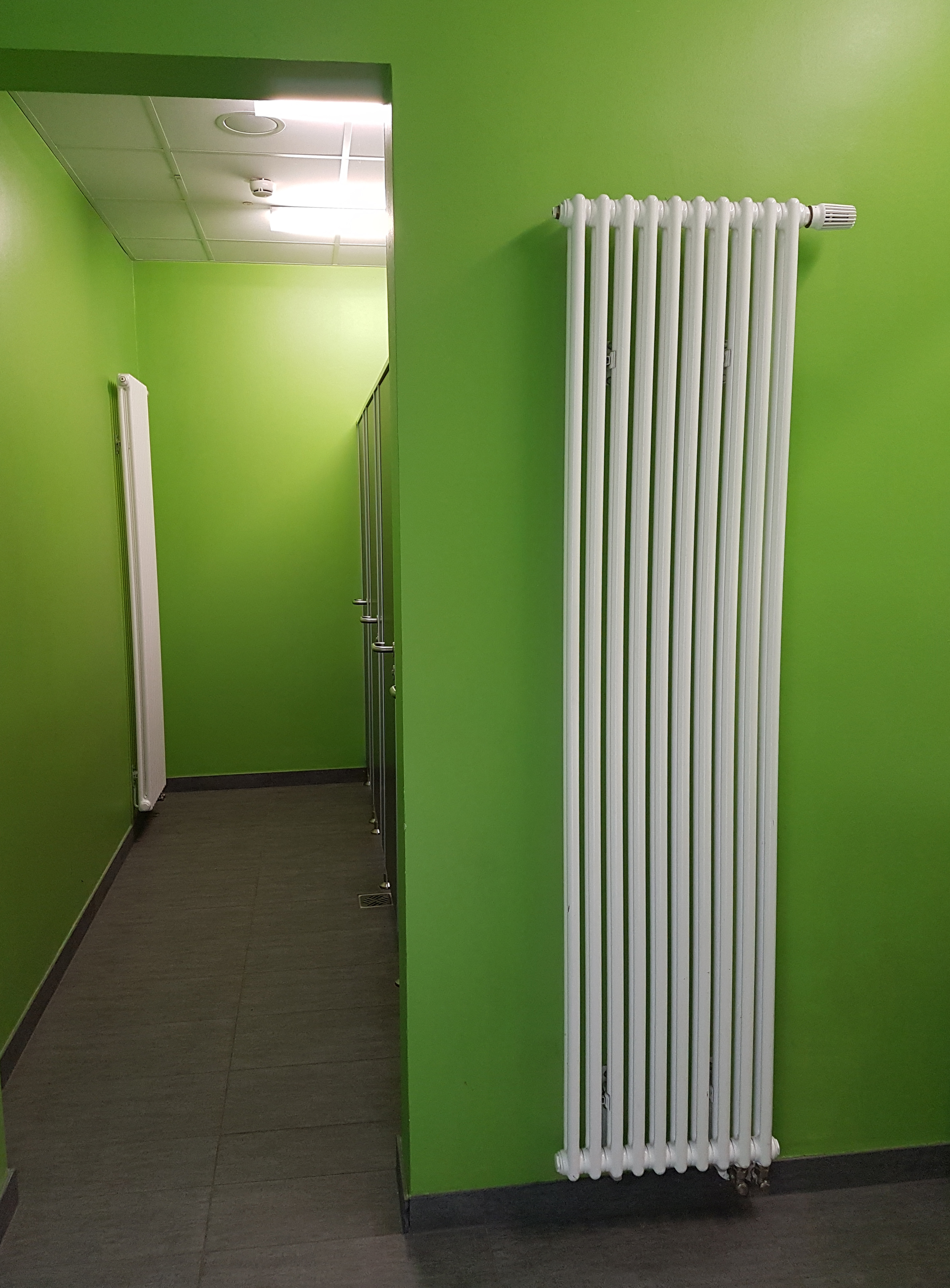 In den neu errichteten Kuben – der Bibliothek, den Ganztagsräumen und auf den Toiletten – kommen insgesamt 20 Heizkörper Zehnder Charleston zum Einsatz. Die elegante Zeitlosigkeit des Design-Klassikers harmoniert ideal mit den bunten Bauwürfeln, die ihn umgeben, und die für ihr kreatives Design mit dem „Deutschen Fassadenpreis 2016“ ausgezeichnet wurden.