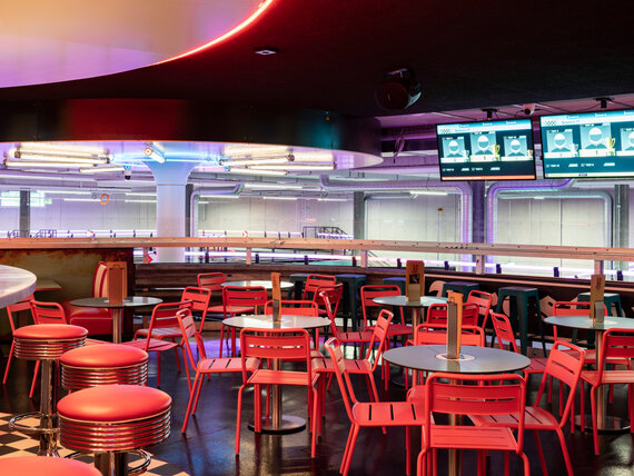 Auch in der Highway 101 Bar, die im Stile eines amerikanischen Diners aus den 1950er Jahren gestaltet ist, sorgen Deckenstrahlplatten für angenehme Strahlungswärme.