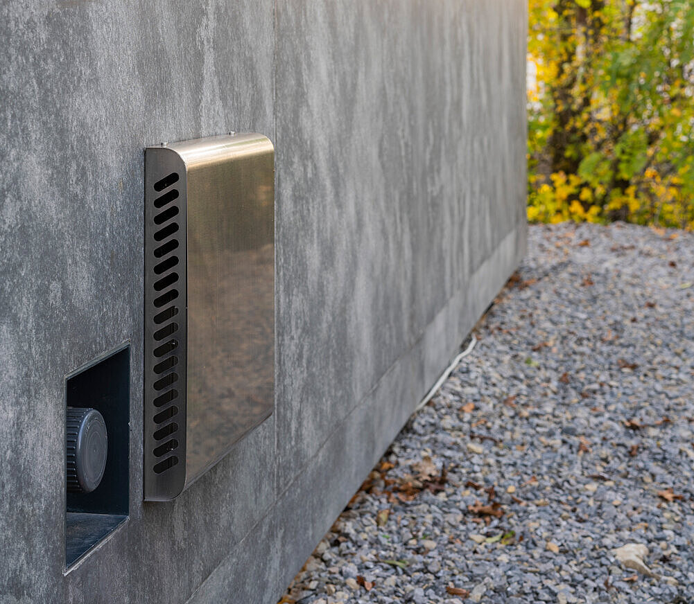 Von außen ist Zehnder ComfoAir 70 nahezu unsichtbar. Lediglich eine witterungsbeständige Außenwandhaube in ästhetischer Edelstahloptik lässt erkennen, dass hier eine smarte Haustechnik für komfortables Raumklima sorgt.