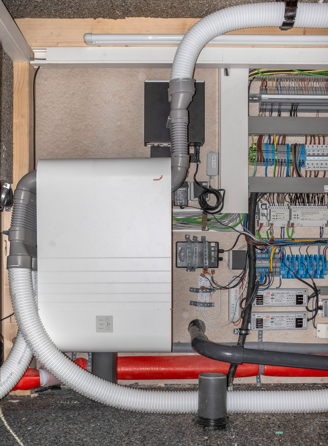 Das dezentrale Komfort-Lüftungsgerät Zehnder ComfoAir 70 ist in der Steuerungszentrale unterhalb des Schlafbereichs im Tiny House untergebracht. Mithilfe eines Zweitraumanschlusses versorgt es das gesamte Haus mit gesunder Frischluft.