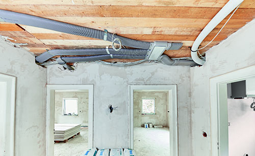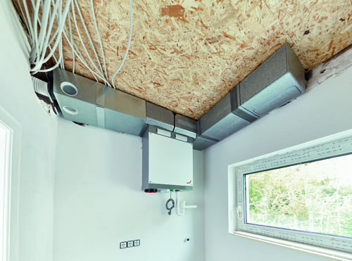 Bei der Installation der Zehnder Komfort-Lüftungssysteme wurden die Lüftungsrohre über der abgehängten Decke verlegt. Vom Abstellraum aus verlaufen sie in die übrigen Räume. Formteile, wie der Zehnder Verteiler flat 51 zur Verteilung der Luftmengen auf die einzelnen Rohrleitungen, erleichtern die Verlegung und sparen Zeit bei der Montage.