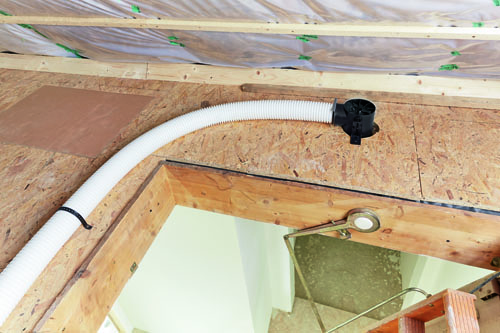 Auf dem Dachboden wurden die Luftleitungen für das Dachgeschoss verlegt. Das Luftdurchlassgehäuse Zehnder TVA-P wird durch die Decke eingesetzt und von der Gegenseite mit einem Ventil versehen. Durch dieses Ventil strömt frische Zuluft in den darunterliegenden Flur.