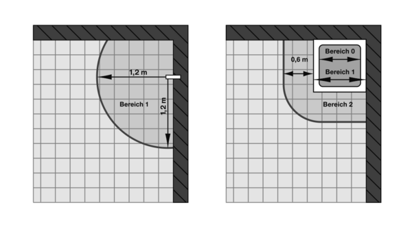 Bei Duschen ohne Wanne darf ein Heizkörper außerhalb des Bereichs 1 montiert werden - Bereich 2 ist für diese Fälle nicht definiert (siehe Abbildung).