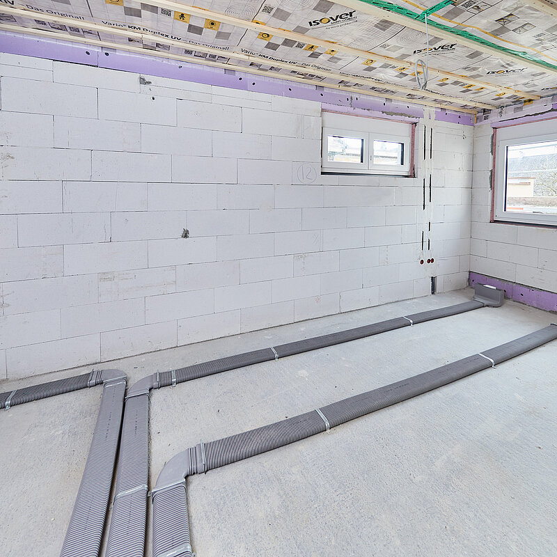 Je nach Bauvorhaben und geplantem Lüftungssystem entscheidet der Fachhandwerker, wie die Luftverteilung am besten installiert wird. Egal ob einbetoniertes Rundrohr, flachovales Lüftungsrohr oder eine Kombination aus beidem – die Lüftungsrohre sorgen später absolut unsichtbar für frische Luft in allen Räumen.