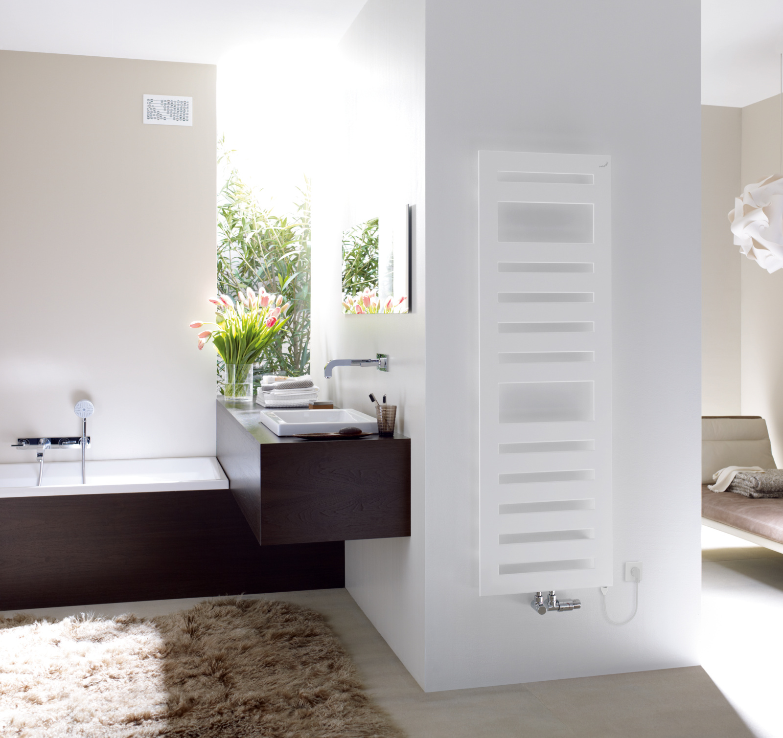 Das innovative Design von Zehnder Metropolitan Spa macht das Bad schöner und das Leben darin angenehmer. Durch die großzügigen Aussparungen dieser Ausführung lassen sich große Handtücher ganz einfach aufhängen.